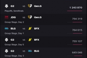 體育資訊3月22日訊 全球先鋒賽G2半決賽橫掃GEN,據Esports Charts統(tǒng)計,本場賽事收視率破百萬,達到124萬人次。