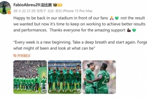 法比奧社媒:現(xiàn)在國安必須繼續(xù)努力,爭取更理想的成績