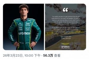 體育資訊3月24日訊 阿斯頓·馬丁車隊宣布,車隊的三號車手杰克·克勞福德將頂替阿隆索,出席日本大獎賽的一練。屆時他將駕駛阿隆索的賽車。
