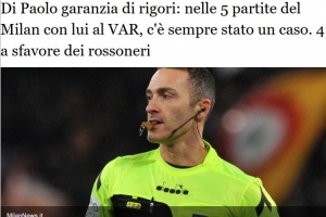 一項引人關(guān)注的統(tǒng)計數(shù)據(jù),在本賽季由迪保羅作為VAR裁判執(zhí)法的米蘭比賽中,總是會出現(xiàn)點球判罰。