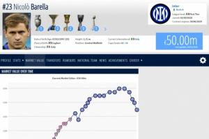 自2024年年底以來,巴雷拉的身價一路從生涯最高的8000萬歐跌到7500萬、6500萬歐、6000萬歐以及今天的5000萬歐。目前巴雷拉的身價仍排在意大利籍球員第三,意甲球員第六,國米隊內(nèi)第三。