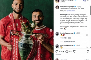 體育資訊3月25日訊 薩拉赫將在本賽季結束后離開利物浦,隊友加克波社媒發(fā)文致敬。