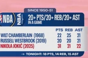 (1968年張伯倫拿到過(guò)22分25籃板21助攻,2019年威少也曾砍下20分20籃板21助攻)