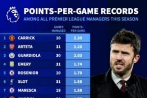 體育資訊3月25日訊 德國轉(zhuǎn)會(huì)市場統(tǒng)計(jì)了本賽季英超主帥的場均積分(至少執(zhí)教3場),并列出榜單,卡里克2.3分居首,阿爾特塔2.26分次席。