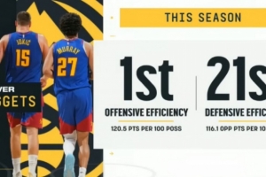 據(jù)統(tǒng)計(jì),本賽季至今,掘金百回合進(jìn)攻效率為120.5,排名聯(lián)盟第一;