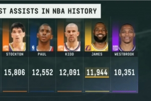 據(jù)統(tǒng)計,詹姆斯生涯至今共送出11944次助攻,排名歷史第4,距離第三的基德僅差不到150次(147次)。