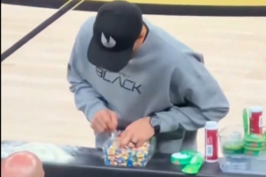 體育資訊3月27日訊 昨日勇士109-106戰(zhàn)勝籃網(wǎng),有網(wǎng)友的鏡頭捕捉到庫(kù)里在場(chǎng)邊偷偷藏糖果一幕。