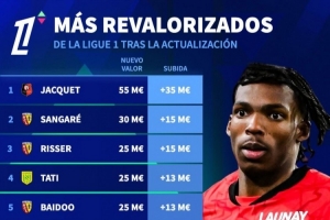 法甲球員德轉(zhuǎn)身價上漲榜:雅凱+3500萬歐居首,埃梅里+1000萬歐