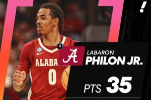 熱門(mén)秀小拉巴隆·菲隆出戰(zhàn)39分鐘21投10中,三分14中6,罰球9中9空砍35分7籃板4助攻。