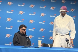 賽后,雷霆球員杰倫·威廉姆斯和霍姆格倫出席了新聞發(fā)布會。兩人著裝配色完全相反,杰倫威調(diào)侃道:“全黑和全白,就像陰和陽。”