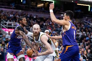 上半場比賽,太陽進攻端主要靠布克和杰倫·格林撐起,二人里突外投都效率在線。布克12中10,三分3中3砍下23分2籃板4助攻;格林12中8,三分5中3砍下19分4籃板1助攻1搶斷。