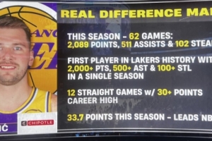 這可是湖人隊史!東契奇單賽季2000分500助100斷 62場就隊史首人