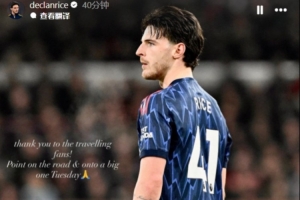 體育資訊1月18日訊 在阿森納客場(chǎng)0-0戰(zhàn)平諾丁漢森林后,賴斯更新了社交媒體。