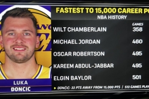 現(xiàn)場給出統(tǒng)計,東契奇距離15000分只差33分,今天是他生涯的第513場比賽。