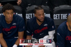 快船迎戰(zhàn)開拓者,第三節(jié)加蘭吃技犯,當(dāng)時(shí)他被阿夫迪亞造犯規(guī),被換下還在抱怨,吃到技術(shù)犯規(guī)。