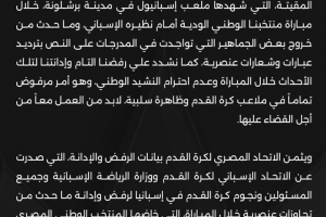 此役西班牙球迷在場上呼喊種族歧視口號,對此埃及足協(xié)發(fā)布聲明:“埃及足球協(xié)會強烈譴責(zé)在巴塞羅那西班牙人球場進(jìn)行的埃及國家隊與西班牙國家隊友誼賽中發(fā)生的令人發(fā)指的種族主義事件,部分現(xiàn)場觀眾高喊種族主義口號,這種行為我們予以完全拒絕和嚴(yán)厲譴責(zé)。此外,對于比賽中出現(xiàn)的不尊重埃及國歌的行為,我們同樣表示堅決反對,此類行為在足球場上是絕對不可接受的,是一種必須攜手根除的負(fù)面現(xiàn)象。
