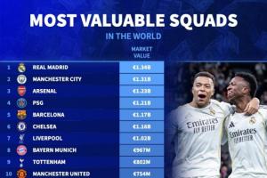 體育資訊04月01日訊 德轉(zhuǎn)統(tǒng)計(jì)了目前全球身價(jià)最高的二十支球隊(duì),其中,皇馬以13.4億歐位居榜首,曼城、阿森納分列二三,前20中有12支英超球隊(duì)。