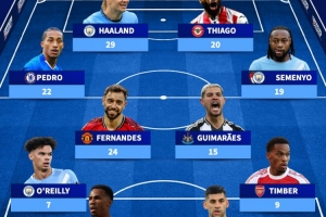 中場(chǎng):若昂·佩德羅(切爾西,22球)、B費(fèi)(曼聯(lián),24球)、吉馬良斯(紐卡,15球)、塞梅尼奧(伯恩茅斯/曼城,19球)