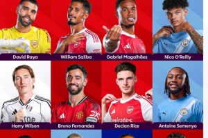 拉亞(阿森納)、薩利巴(阿森納)、加布里埃爾(阿森納)、奧賴?yán)牵⒐铩ね栠d(富勒姆)、B費(曼聯(lián))、賴斯(阿森納)、塞梅尼奧(伯恩茅斯/曼城)、伊戈爾·蒂亞戈(布倫特福德)、哈蘭德(曼城)、佩德羅(切爾西)