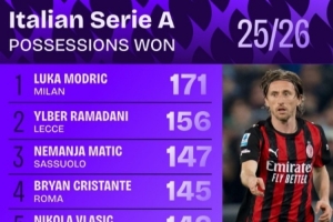 體育資訊4月3日訊 足球數(shù)據(jù)網(wǎng)站Squawka統(tǒng)計本賽季至今意甲球員奪回球權(quán)排行榜,40歲莫德里奇171次第一,馬蒂奇第三。