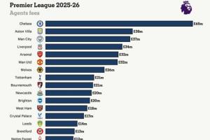 英超球隊經(jīng)紀(jì)人費用:切爾西6500萬鎊領(lǐng)跑,維拉、曼城利物浦前四