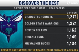 黃蜂主場迎戰(zhàn)步行者,轉(zhuǎn)播方給出本賽季球隊(duì)三分命中總數(shù)Top5: