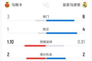 皇馬0-1馬略卡半場(chǎng)數(shù)據(jù):射門(mén)8-3 馬略卡1射正即取得進(jìn)球