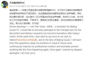 Sincere Apology——I am Han Yuhao(KIMI), a translator for Beijing Guoan FC. I would like to sincerely apologize to the Chengdu fans for the discomfort and distress caused by my incorrect translation after today's match. At the same time, I also want to say sorry to my club, to Fábio@法比奧 , and to the fans of Beijing Guoan. I will learn from this experience, keep my emotions in check in future work, continuously improve my professional conduct, and resolutely prevent anything like this from happening again. Once again, I extend my deepest apologies: I am truly sorry.