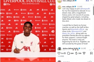 恩迪亞耶寫道:“我非常高興能加入利物浦俱樂部,開啟我首次海外效力經(jīng)歷。這是一家夢想中的俱樂部,擁有輝煌的歷史和豐厚的成功底蘊(yùn),由眾多偉大球員塑造而成,其中包括馬內(nèi),正是他讓我懷揣穿上這身球衣的夢想。