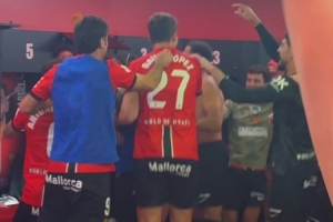 賽后馬略卡球員在更衣室內(nèi)激情慶祝,更衣室的桌子上擺滿了美食。