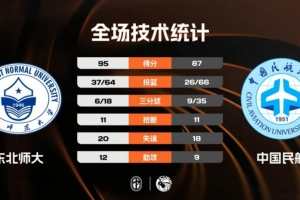 末節(jié)比賽,中國民航先拿5分縮小分差,東北師大及時(shí)調(diào)整給出回應(yīng),僵持半節(jié)之后中國民航的外線突然投開,連續(xù)命中三分球后分差僅剩3分,關(guān)鍵時(shí)刻閆思愷也是強(qiáng)投三分命中幾乎殺死了中國民航逆轉(zhuǎn)的希望,最終東北師大力克中國民航成功晉級(jí)。