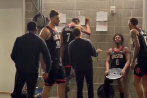 賽后,騰訊ESPN記者孟超發(fā)博曬出視頻,并寫(xiě)道:“險(xiǎn)勝勇士之后,火箭賽后在更衣室外全體加練?!?/p>