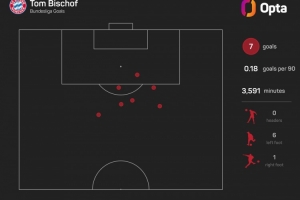 據(jù)Opta統(tǒng)計,比朔夫上賽季以來在德甲打進(jìn)7球,其中6球是禁區(qū)外破門,同期德甲禁區(qū)外進(jìn)球數(shù)量僅少于凱恩(7球)。