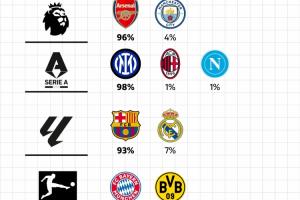 體育資訊04月06日訊 歐洲五大聯(lián)賽已經(jīng)接近賽季尾聲,數(shù)據(jù)網(wǎng)站Football Rankings根據(jù)聯(lián)賽分?jǐn)?shù)、近期狀態(tài)、剩余賽程等因素,列出了各聯(lián)賽球隊(duì)奪冠概率,五大聯(lián)賽領(lǐng)頭羊奪冠概率都超過了90%。