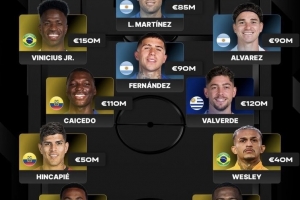 前鋒:維尼修斯(巴西、皇馬、1.5億歐)、勞塔羅(阿根廷、國米、8500萬歐)、阿爾瓦雷斯(阿根廷、馬競、9000萬歐)