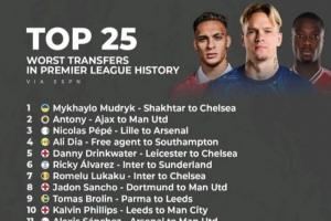 體育資訊4月7日訊 ESPN評選出了英超歷史最糟糕的25筆轉(zhuǎn)會,穆德里克加盟切爾西居首,安東尼加盟曼聯(lián)次之。