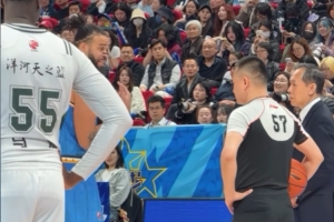首節(jié)末段,場(chǎng)上出現(xiàn)了一個(gè)小插曲,麥基剛登場(chǎng)一回合,比賽就被裁判叫停,原因是麥基佩戴的牙套不合規(guī)定,最終許利民不得不用周琦將麥基換下。