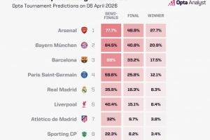 Opta超算預(yù)測歐冠(四強(qiáng)-決賽-奪冠)