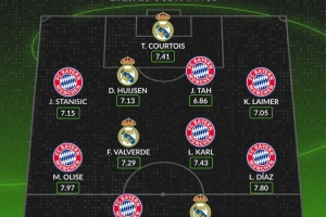 體育資訊4月8日訊 皇馬和拜仁將在本輪歐冠八強(qiáng)戰(zhàn)相遇,whoscored也統(tǒng)計(jì)了兩隊(duì)本賽季歐冠評(píng)分合體最佳陣容。