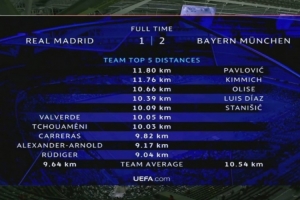 體育資訊4月8日訊 在歐冠淘汰賽首回合,拜仁2-1擊敗皇馬。以下為雙方球員本場(chǎng)比賽跑動(dòng)數(shù)據(jù)前列的球員。