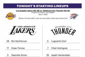 體育資訊04月08日訊 今日10:30,湖人將在主場再戰(zhàn)雷霆。