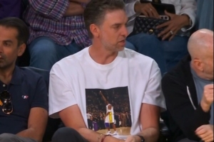 湖人名宿大加索爾來到現(xiàn)場觀戰(zhàn),身上穿著一件印有科比81分慶祝動作的T恤。