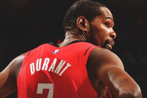賽后火箭官方曬出本場(chǎng)贏球海報(bào),封面人物是杜蘭特。