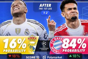本場賽前,皇馬晉級歐冠四強(qiáng)的概率為34%,拜仁為66%;首回合比賽結(jié)束后,皇馬的晉級概率被下調(diào)至16%,拜仁則上升至84%。