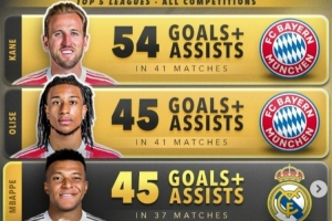 本賽季五大聯(lián)賽球員總參與進(jìn)球榜:前五拜仁三人+姆巴佩、哈蘭德