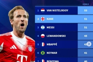 凱恩生涯67場歐冠進51球,相同場次進球數(shù)僅次于范尼,與梅西相同