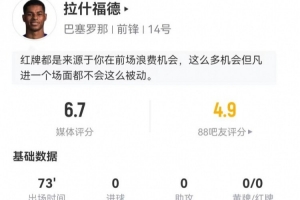 體育資訊4月9日訊 巴薩在本輪歐冠0-2落后馬競(jìng),拉什福德本場(chǎng)數(shù)據(jù)如下: