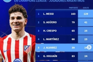 阿根廷球員歐冠進球榜:梅西129球居首,阿爾瓦雷斯24球升第五