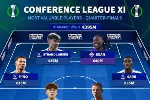 德轉(zhuǎn)公布?xì)W協(xié)聯(lián)1/4決賽身價(jià)最高十一人:水晶宮獨(dú)占九席