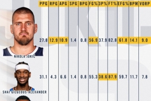 約基奇在場均籃板、助攻、投籃命中率、有效命中率、基礎(chǔ)正負值(BPM)和替代球員價值(VORP)六項數(shù)據(jù)方面都排在四位MVP候選人中的首位。